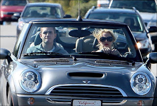 But here's Britney & her new mystery man out on the town in Britney's topless Mini Cooper. Joy.